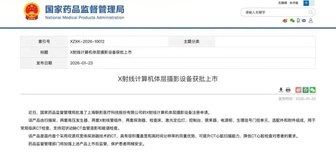 近日,国家药品监督管理局批准了上海联影医疗科技股份有限公司的X射线计算机体层摄影设备注册申请。这是本市今年第2款获批上市的Ⅲ类创新医疗器械。