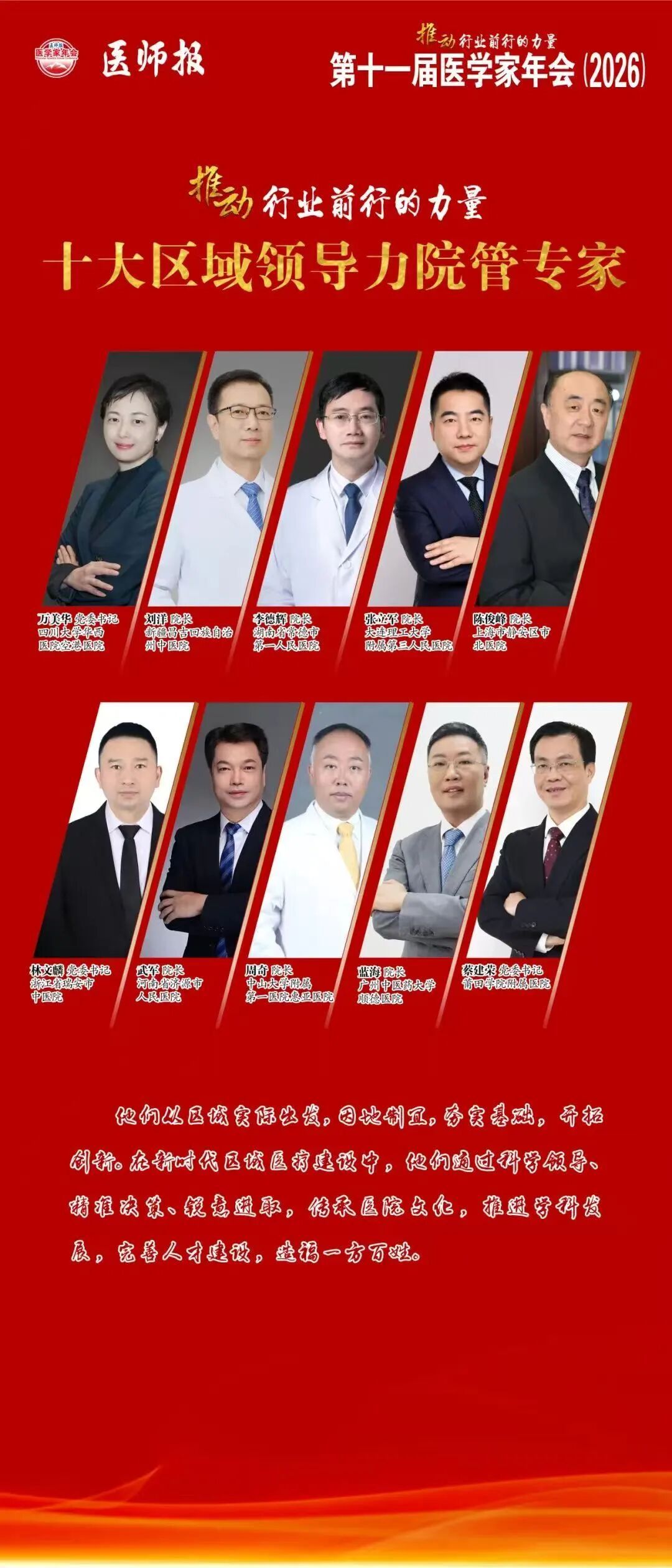 近日,由北京医师报社主办的第十一届医学家年会(2026)举行。大会以“医学数智化·健康现代化”为主题,重磅发布“2025年度十大区域影响力院管专家”榜单。