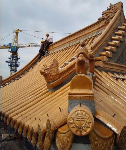 外墙主体为半干挂预制混凝土挂板,基座为浅色预制,混凝土须弥座形式门窗融合竖向长条窗与中式八角窗形成错落有致的立面韵律。