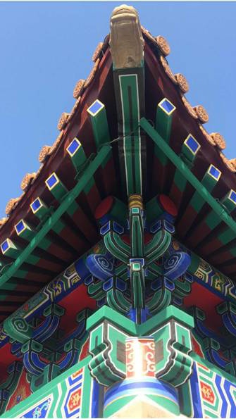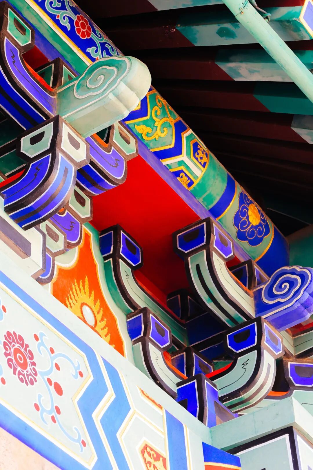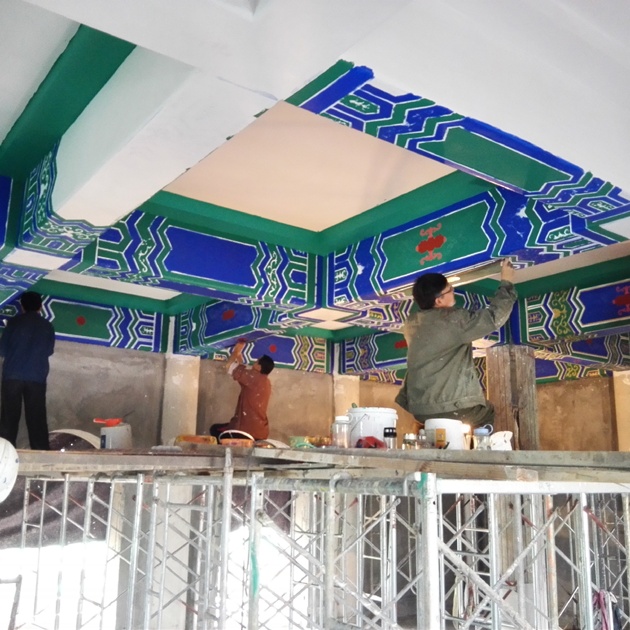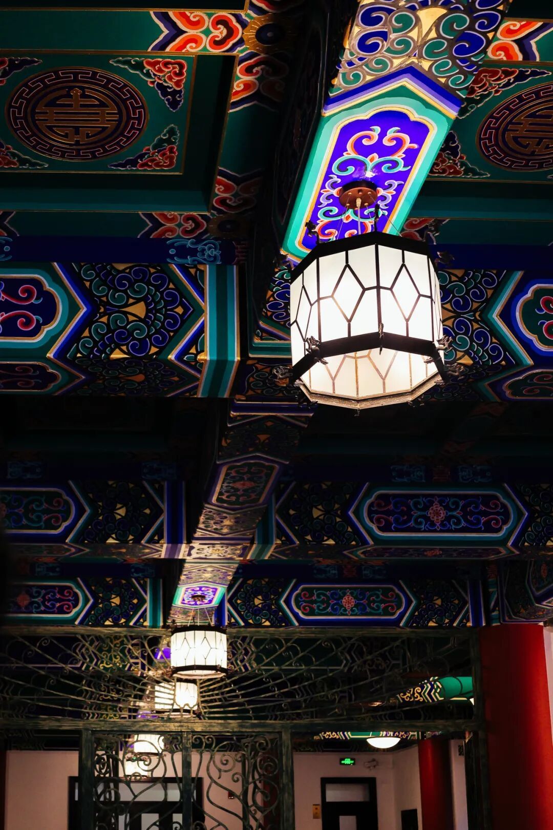 建筑彩画尤为精湛,一、二楼外厅梁枋饰以青绿方心式旋子彩画,天花藻井则为硬天花,方心内绘吉祥草。