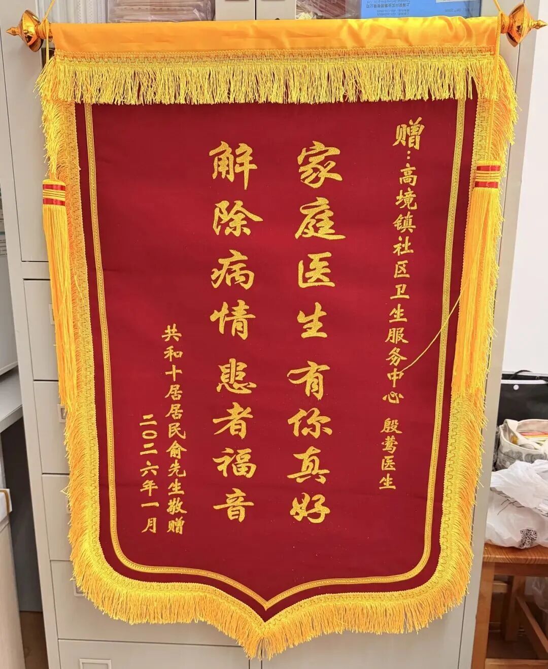 于是便有了开头的一幕——俞先生拄着拐杖,坐着网约车,专程赶往高境镇社区卫生服务中心,亲手将写有“解除病情患者福音,家庭医生有你真好”的锦旗,送到了殷莺医生手中。一面锦旗,不仅是对个人的认可,更是对基层家庭医生群体的致敬。
