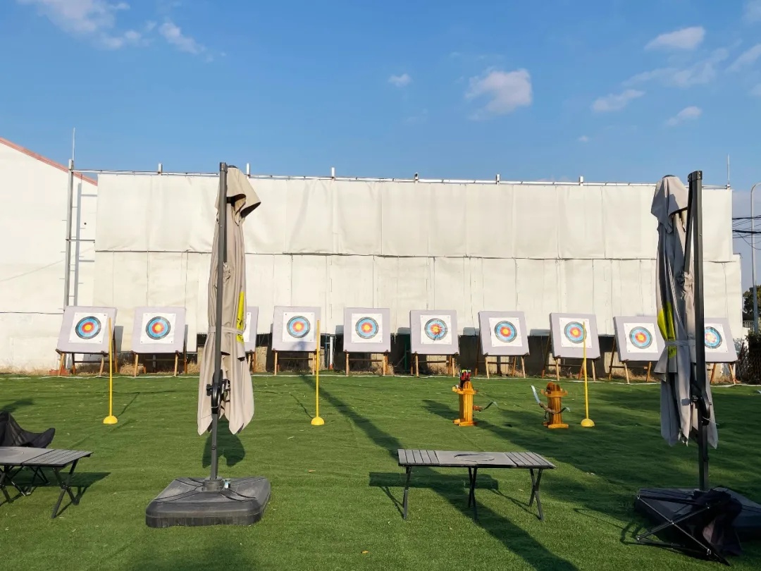 为了增添更多的体育项目,俱乐部辟出射箭营地。十个专业靶位,靶位后铺设6米高、20米长的挡箭布,保障游客的安全。在600多平方米的空间内,从12磅到34磅不同拉力的强度,让小朋友到成年人都能找到乐趣。“搞体育的多少有种情怀,希望带动更多人动起来,价格便宜点也没什么关系。”岳教练说。当夜幕降临,4盏大灯亮起,可以从早到晚体验射箭的乐趣。