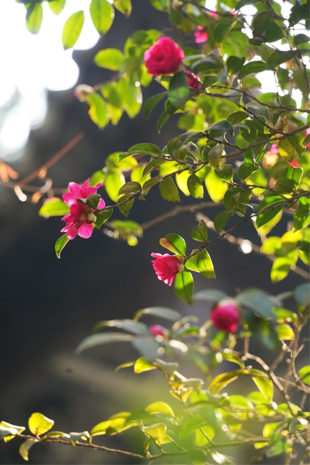 茶梅作为山茶科常绿灌木,其革质叶片终年苍翠,在冬日更显深邃。花朵兼具茶花丰润与梅花清逸的神韵,单瓣、半重瓣的花型层层叠叠簇拥着金黄花蕊,形成“花中嵌玉”的视觉效果。竹枝山上,丰盈的树冠以泼墨手法点亮灰暗天际,形成“万绿丛中点点红”的立体画卷。