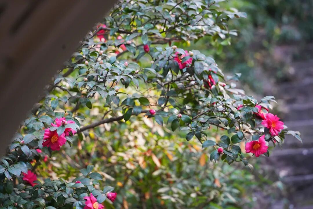 茶梅花期超长,通常可以从11月持续到次年3月,而这也恰好弥补了冬季园林的色彩空白。其耐阴特性使其成为林下空间的理想地被植物,与蜡梅、红枫构成“岁寒三友”的现代演绎。古猗园相关工作人员介绍,园内茶梅最佳观赏点位于缺角亭东侧、茶室南侧,观赏期将持续至2月中旬。