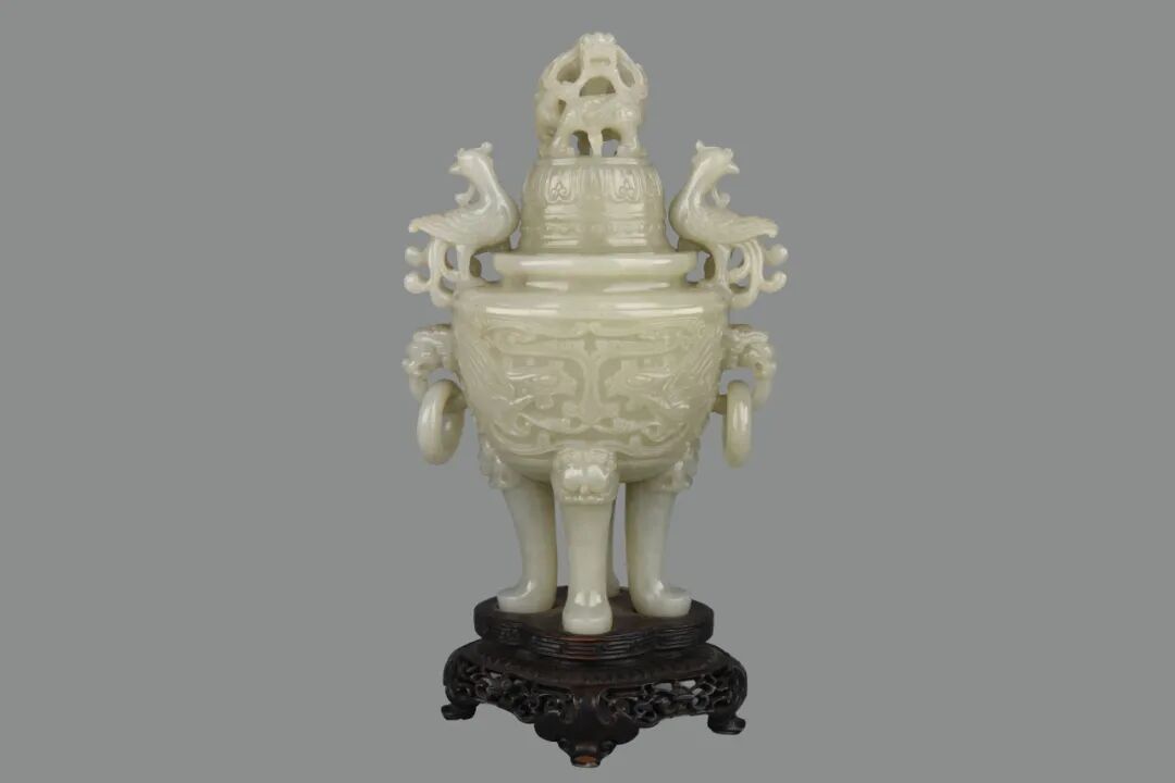 ▲ 清 青白玉龙钮兽面纹双凤耳四足炉