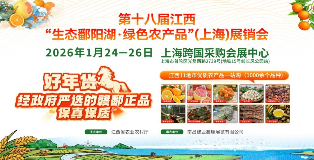2026年1月24日至26日,由江西省农业农村厅重点打造的农产品推广平台--第十八届江西“生态鄱阳湖・绿色农产品”(上海)展销会于上海跨国采购会展中心举办。本届展销会以生态、绿色、优质、品牌等关键词为核心主题,严选全省11个设区市的优质特色农产品,从赣南脐橙的酸甜多汁、南丰蜜桔的清香爽口,到江西茶的醇厚回甘、军山湖大闸蟹的膏腴鲜嫩,全面展示江西现代农业发展成果,深化赣沪两地农业产业合作,推动优质农产品深度融入长三角市场,每一款产品都带着江西的山水灵气与匠心坚守。 本届展会规模升级、亮点纷呈,特装集中展示江西特色农业产业集群与品牌企业风采,标展则网罗数千种家常好物,从有机大米、富硒果蔬到非遗腊味、手工茶点,覆盖生鲜、粮油、茶饮、休闲食品等全品类。宜春的山茶油、赣州的客家米酒、景德镇的桃酥、抚州的白莲、萍乡的莲花血鸭等近300余家参展企业携核心产品亮相,其中不乏地理标志产品、有机认证好物、江西老字号等“赣鄱正品”硬货,一站式购齐安全地道的江西生态年味。 更值得期待的是,展会期间同步举办企业专场推介会、农产品电商对接会等精彩活动。京东、美团生鲜、盒马等知名电商平台负责人亲临现场,搭建产销对接桥梁;企业轮番登场展示产品特色,互动表演穿插其间,让逛展不仅是“买买买”,更是 “品味江西 + 爱上赣鄱”。严格的质量把控体系确保所有参展产品均通过权威认证,部分生鲜产品还搭载“区块链溯源 + 合格证”,让大家买得放心、吃得安心。 赣沪情深,农味相连。这不仅是一场农产品的展销盛会,更是赣沪两地农业合作的深化与延续。让我们奔赴一场生态与美味的约会,把江西的山水风味、地道年味带回家!