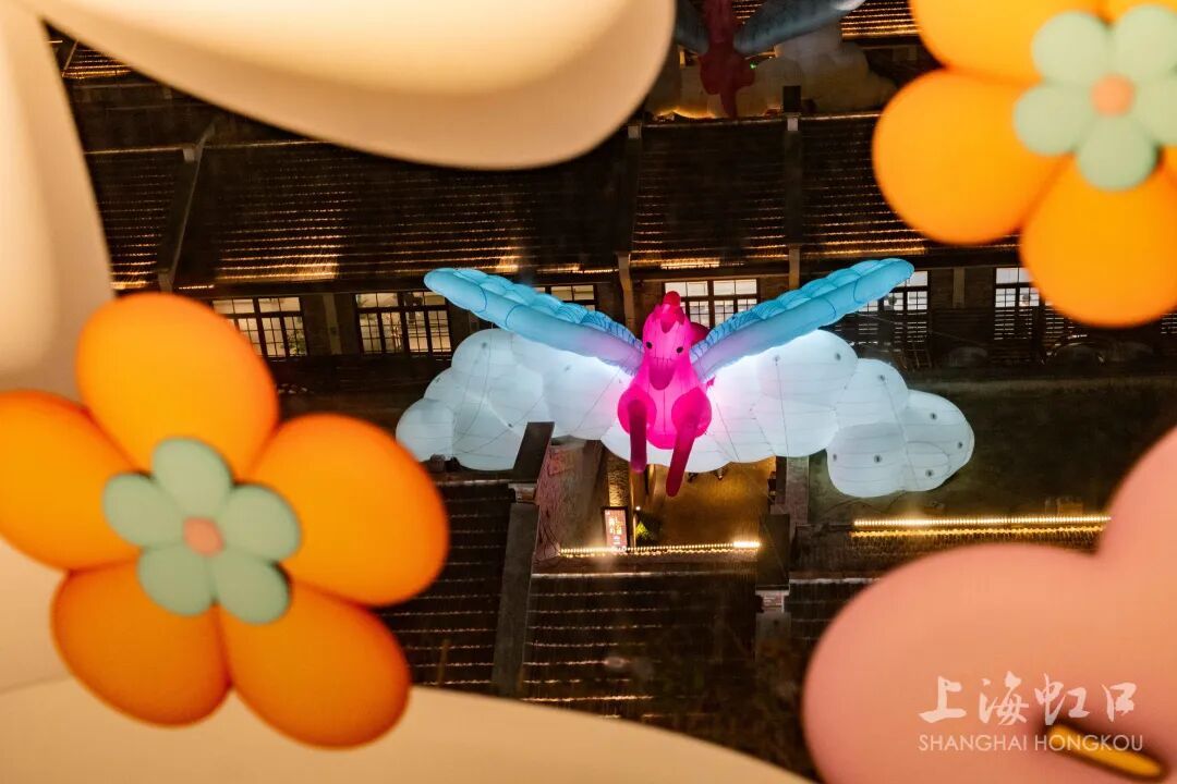 1月23日,“乐游虹口中国年”海派灯会正式亮灯。当晚,滨港·今潮8弄“亮马生花”“骏跃瑶台”“驰梦甜爱”“驭马游春”四组大型灯光艺术装置同步点亮。马的灵动与春的暖意融入百年弄堂肌理,为市民游客呈现中西意象碰撞共生的新春图景。 点我回顾新闻>>>海派灯会点亮“乐游虹口中国年”,虹口打造一站式文旅商体展新春潮体验 作为滨港·今潮8弄连续第5年推出的海派春节元宵主题活动,本次灯会以“浪漫、鲜活、互动”为设计基调,兼顾具象形态与抽象表达,为市民游客打造沉浸式赏灯体验。 南广场的“亮马生花”装置以“繁花伴马贺新春”为灵感,采用绑扎气球艺术形式,以巨型充气花朵环绕白马造型,通过艳丽色彩与灵动形态,传递生机与希望。白马或休憩或踱步的造型憨态可掬,将春日花海的绚烂与马年寓意浓缩于一处。 弄堂屋顶的“骏跃瑶台”装置颇具奇幻感,粉蓝色飞马造型搭配蓬松白云元素,宛若仙灵降临。行人穿梭弄堂时,可感受天马“掠过”的梦幻意境。从甜爱廊俯瞰,更能完整观赏天马随云影游弋弄堂的全景,百年弄堂由此变身沉浸式新春童话场,传递“以梦为马、心愿成真”的祝福。 甜爱廊沿廊玻璃则呈现“驰梦甜爱”景象,延续“亮马生花”的艺术风格,满贴白马踏花、春风得意的图案,将马匹与繁花交织定格。游人漫步廊间,可直观感受“马伴花行、爱随春至”的甜蜜氛围,与南广场装置形成呼应。 中庭的“驭马游春”装置以旋转木马为设计核心,采用正红主色调契合新春氛围。8匹小马在主体结构中上下灵动跳动,周边12只摇马同步营造欢腾氛围,配合屏幕及地台条纹装饰,增强装置“旋转”动感。该装置设置互动环节,游人可通过摇马与地贴参与体验,寄托马年顺遂纳福的美好心愿。 此外,为积极营造春节期间节日氛围,区绿容局在滨港·今潮8弄周边四川北路、武进路等路段综合杆及路灯杆上悬挂中国结灯光装置,亮灯时间与路灯同步开启,中国结灯光装置兼顾氛围营造与绿色低碳,在保留夜景氛围的同时,增添四川北路“丰”字区域传统年味。 据悉,“骏影瑶光”灯会将持续至3月3日。 记者:何娉 图片:杨伯荣、滨港·今潮8弄 编辑:何娉