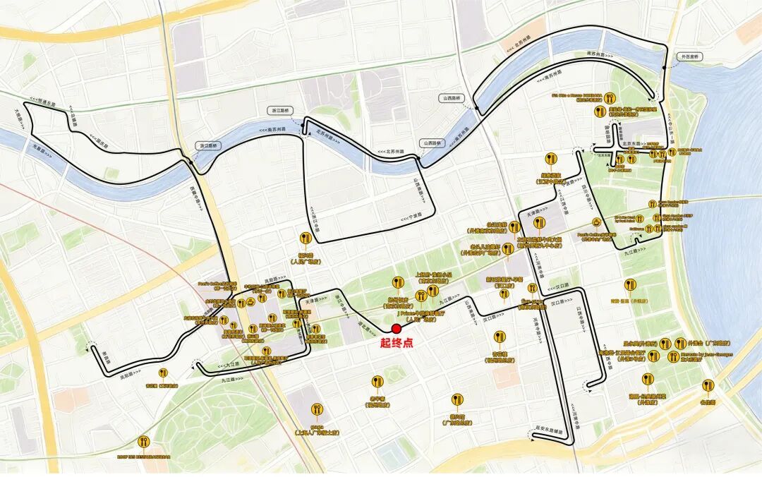 活动现场,“环球美食跑”线路图正式发布。该线路以网络热传的黄浦区“奔马”跑步路线(源自小红书用户“LE0的溜达”)为蓝本,串联区内多个特色商业与美食地标,形成一条独具魅力的城市漫游路径。