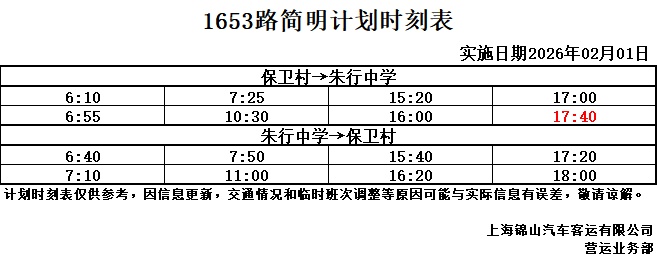 1653路自2月1日(星期日)首班车起,调整首末班车时间,具体调整如下: