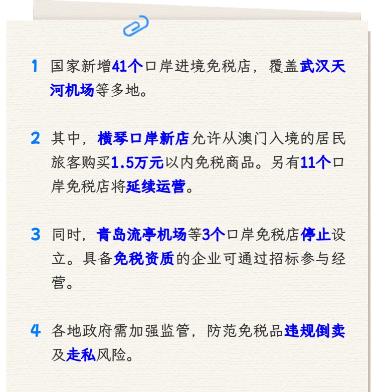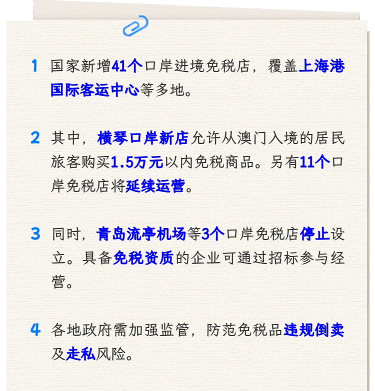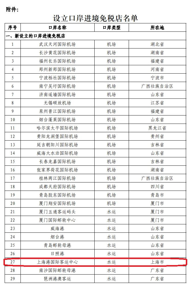 为进一步发挥免税店支持提振消费作用,经国务院同意,财政部、商务部等部门就设立口岸进境免税店等有关事宜发布通知,决定在上海港国际客运中心等41个口岸各新设1家口岸进境免税店。
