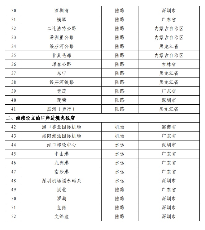 二、继续在海口美兰国际机场、蛇口邮轮中心等11个口岸设立口岸进境免税店(在本通知所附《设立口岸进境免税店名单》中为序号42—52)。