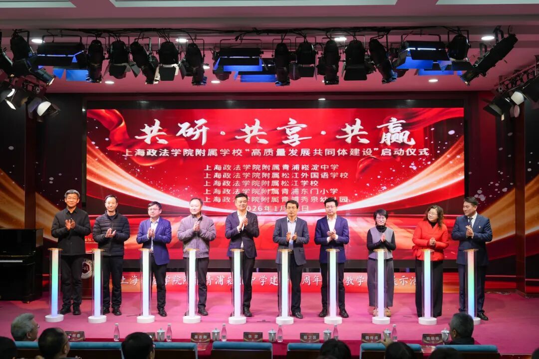 活动现场,“共研·共享·共赢”上海政法学院附属学校“高质量发展共同体建设”仪式举行。为筑牢教育高质量发展根基,上海政法学院各附属学校此前开展多次校际教研、资源互通等系列活动,以点滴积累凝聚发展合力。未来,各附属学校将以共同体为纽带,持续深化协同合作,推动优质教育资源共建共享,在互补互促中实现整体跃升。