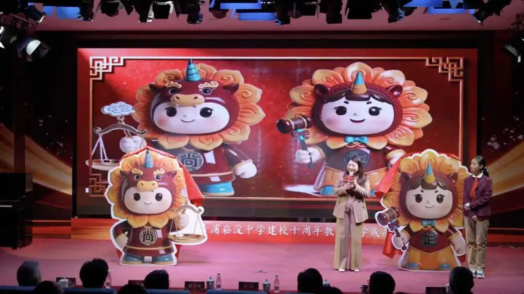 现场还揭晓了崧淀中学吉祥物“尚尚”“正正”,其命名源自学校“砥砺琢磨”的校训,深度契合深耕多年的“尚正教育”理念。吉祥物设计巧妙融合獬豸、天平、法槌等法治元素,彰显学校鲜明的法治办学特色;头顶的向日葵冠则承载着阳光向上的童趣内涵,象征学子们如向日葵般向阳而生、逐光而行的精神风貌。