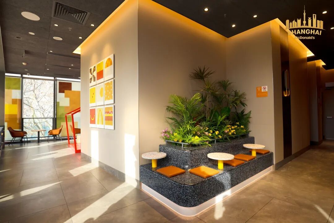 该旗舰店有两层空间,总面积近400㎡,将打造为LEED金级绿色餐厅。设计采用CUBE风格,将“立方、暖色、微笑”三大元素与落地玻璃窗、二层金色拱门标识结合,呈现明快的都市氛围与生动的童趣记忆。