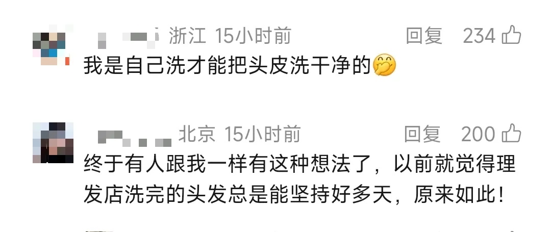 理发店采用后仰式洗头池,水流能顺发根方向充分冲洗,洗发师也会反复用温水冲净泡沫和污垢。相比之下,在家受姿势和水流限制,容易冲洗不彻底,残留的洗发产品会让发根变“重”,吹干也难蓬松。