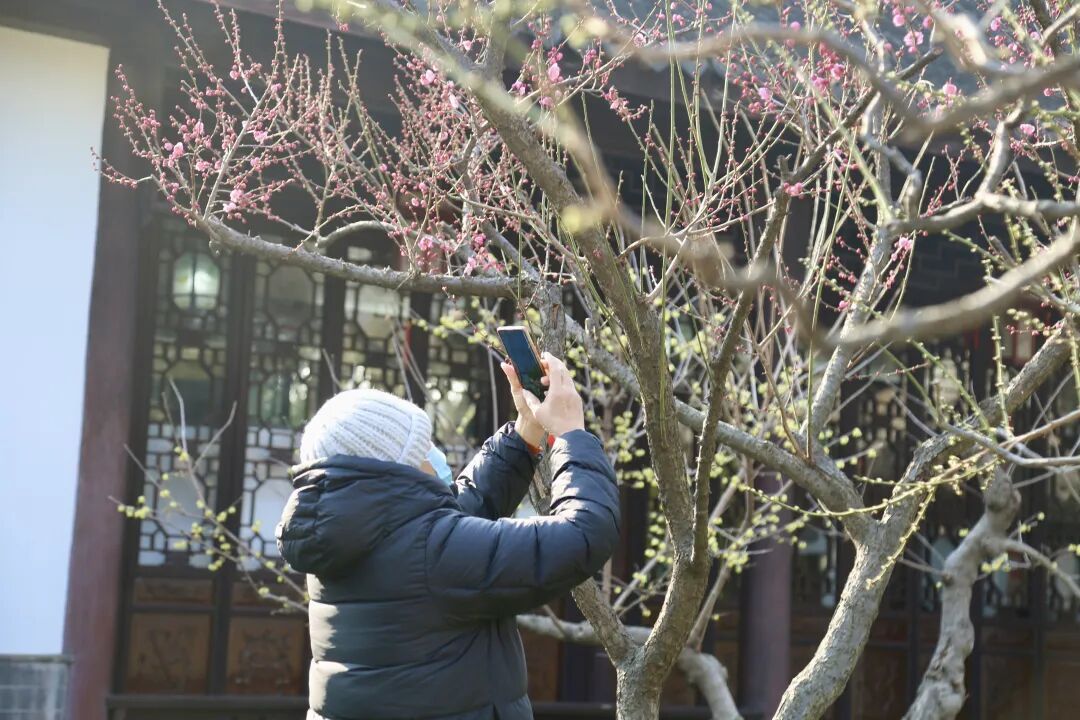 循着小径前行,疏影横斜的枝条、凝脂如蜡的花瓣,与古色古香的亭台楼阁相互映衬,宛如一幅徐徐展开的古典画卷,吸引了不少摄影爱好者前来。