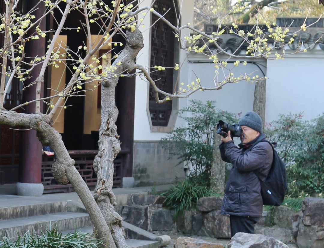 “今年花期是晚了点,但天气好,拍起来正合适。”游客朱明元笑着说,“蜡梅还是得配古建筑看,像墙角、老树、灰瓦白墙这些元素都有了,画面一下子就有‘味道’了。”