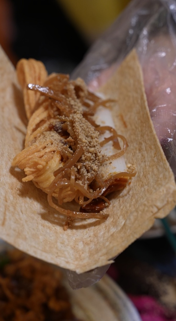 现摊的脆饼,卷上沂蒙馓子、鸡蛋咸菜丝、秘制酱料,再撒一把自家磨的芝麻盐。一口咬下去,脆的、香的、咸的、鲜的在嘴里层层散开,满是粮食的自然香气。