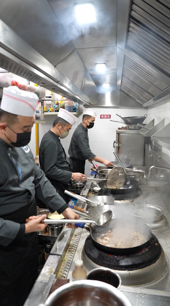 这家淄博姐妹开的小店,姐姐当掌柜,妹妹管厨房,厨师是有10年功底的妹夫。正值寒冷天气,铁锅猛火、酱香四溢的临沂炒鸡,成了不少食客的选择,中午时段常常坐满。后厨同时开火翻炒不停,热气升腾。