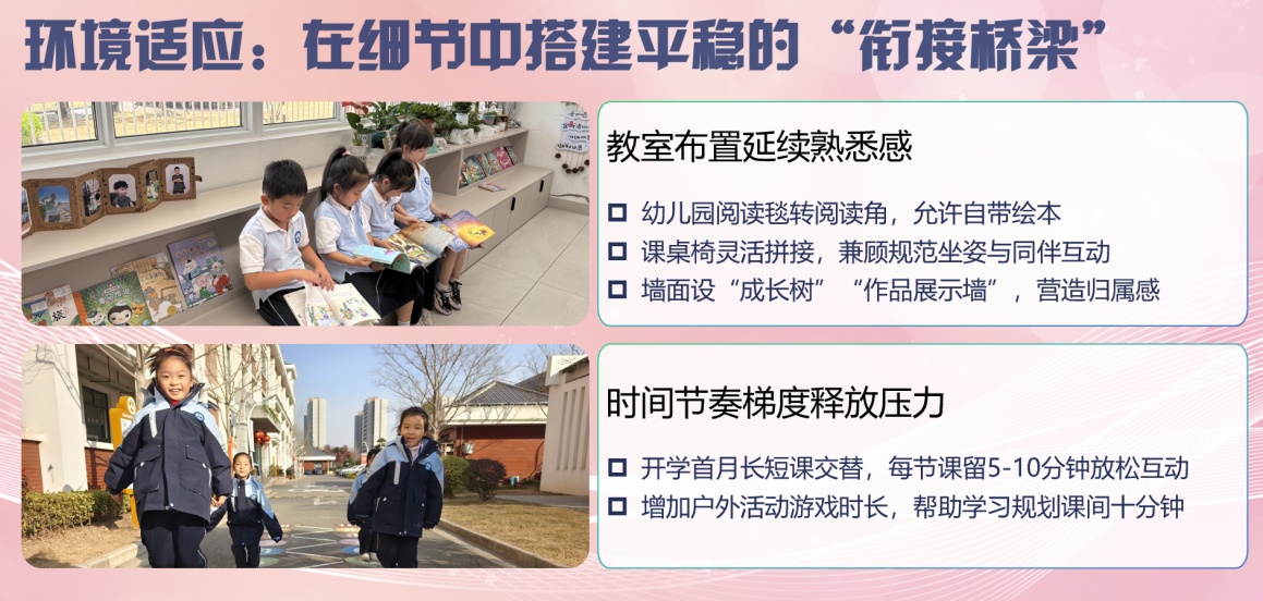 南汇外国语小学则在新生入学首月实行“长短课交替”,每节课预留放松时间,增加户外活动,逐步引导新生适应小学作息。而一年级学科教学的“游戏化包装”与“生活化融合”,实现知识教育的“缓坡上架”,过程性评价和多元评价,则让老师在欣赏中守护学生的“自信阶梯”。