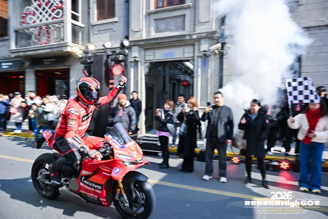 “5、4、3、2、1”倒数计时响起,充满仪式感的方格旗挥舞,一辆红色杜卡迪摩托车飞驰而过,首届2026静安新春时尚HighGO节热力启幕。