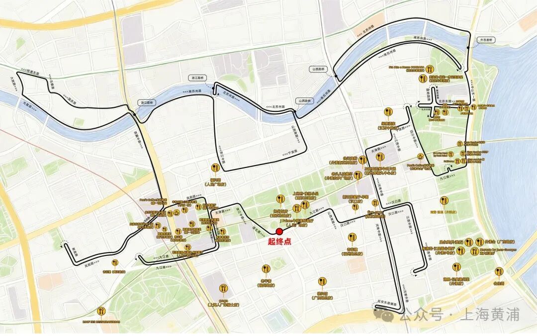 活动现场,“环球美食跑”线路图正式发布。该线路以网络热传的黄浦区“奔马”跑步路线(源自小红书用户“LE0的溜达”)为蓝本,串联区内多个特色商业与美食地标,形成一条独具魅力的城市漫游路径。
