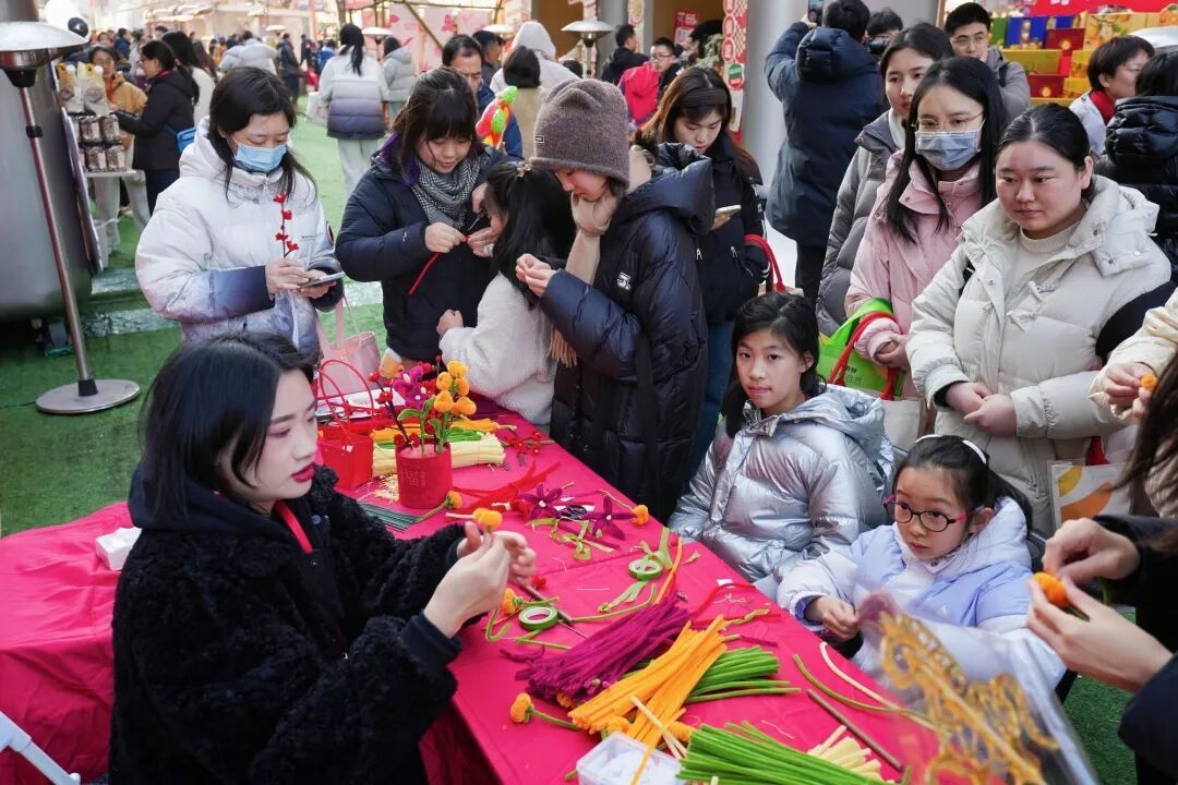 除了吃,现场的互动体验区更是热闹非凡。DIY年宵花、画糖画、写福字、花样剪纸,老手艺人们的摊位前围满了大小朋友,大家都想亲手剪个新年好彩头。