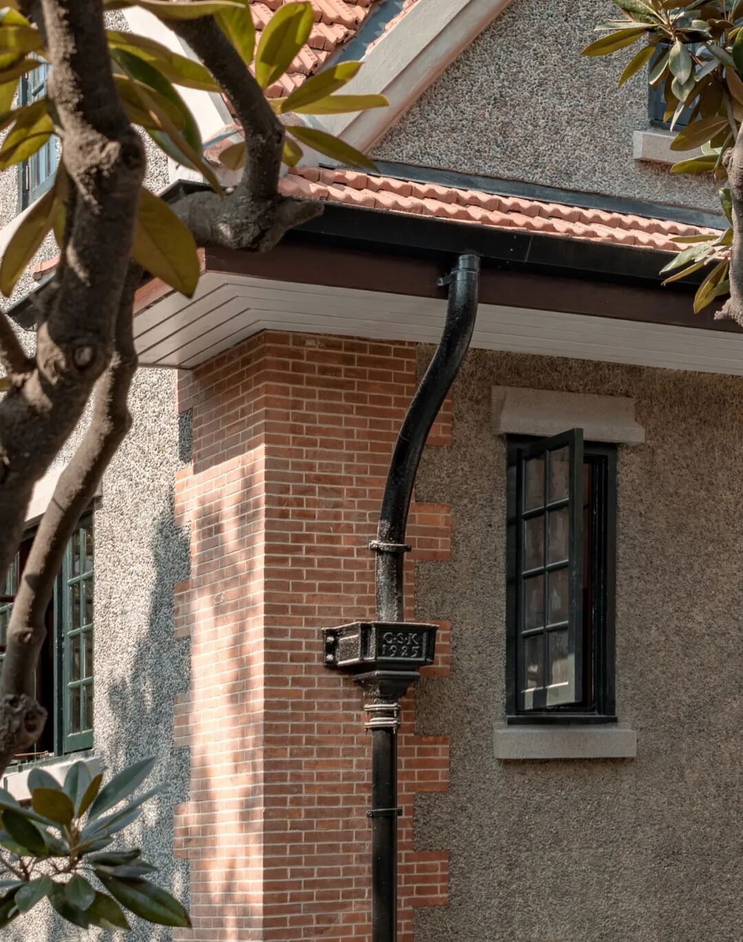 愚园路1320弄10号楼坐落于愚园路上长宁金融园内,红瓦坡屋顶错落有致,清水砖墙与卵石立面相映成趣,坡屋顶上的老虎窗线条利落,墙角铸铁水落斗上“1925”的字样清晰可辨。