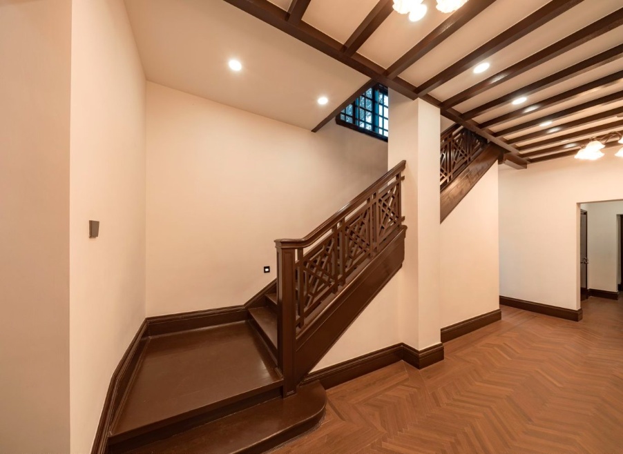 修缮前,岁月侵蚀已让建筑伤痕累累:屋面局部坍塌、爬山虎布满墙面,卵石外墙风化脱落,后期修补的石子大小混杂,木构件被白蚁蛀蚀得千疮百孔,室内被敲除的壁炉仅留模糊痕迹。2024年,在政府相关部门牵头协调下,新长宁装饰公司以“修旧如故、文脉永续”为核心,开启了这场精细的“时光修复术”。