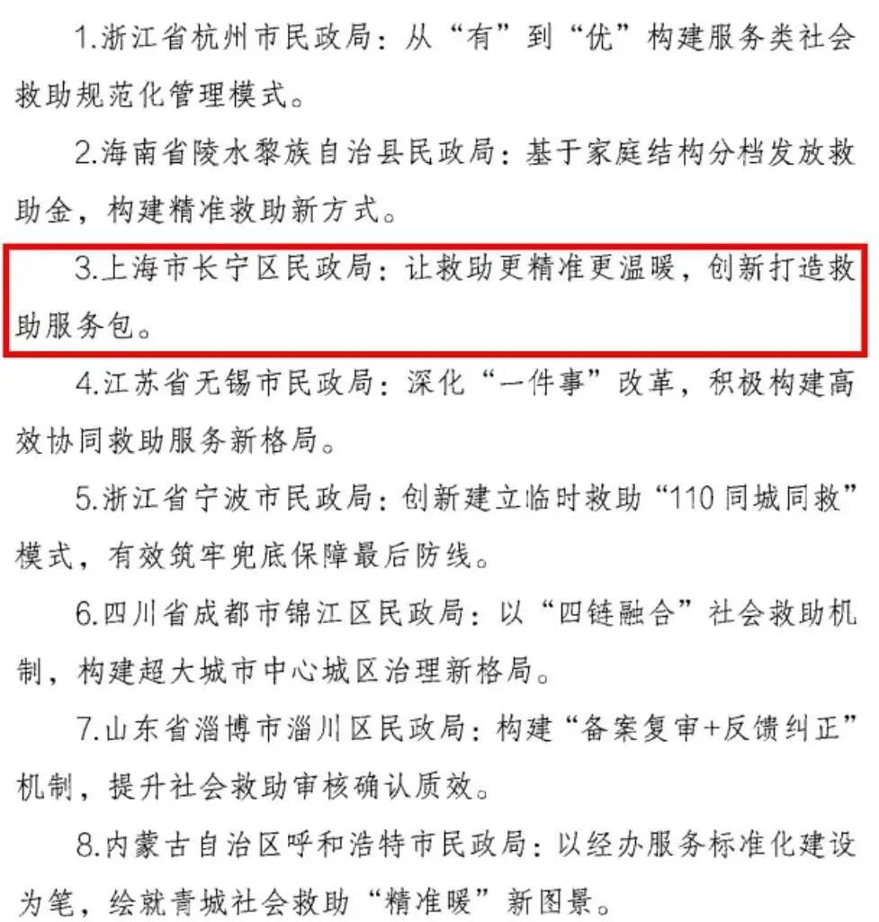 近日,民政部办公厅印发《关于发布2025年度社会救助领域创新实践典型案例的通知》,区民政局申报的“让救助更精准更温暖,创新打造救助服务包”案例成功入选。这是长宁区继此前两次获评该领域创新实践典型案例后,再次荣登国家级榜单,成为全国范围内唯一一个三次获得此项荣誉的地区,彰显了长宁在社会救助领域持续深化改革、探索精准服务的卓越成效和引领示范作用。