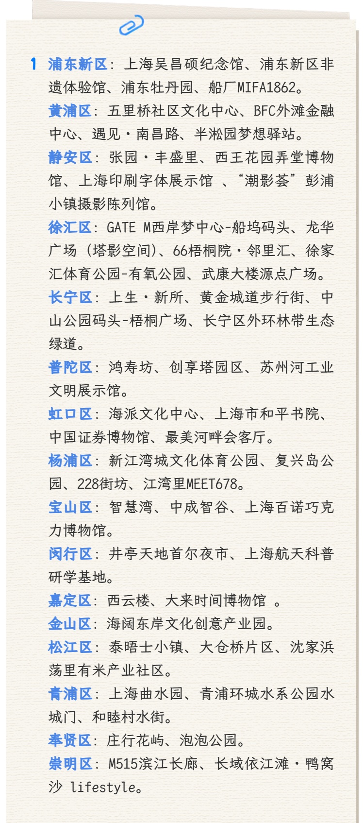 市文化旅游局介绍,为进一步提升社区旅游的品质与内涵,推动“家门口的好去处”迭代升级,挖掘并打造一批兼具生活温度与旅游吸引力的社区旅游示范点,市文旅局开展第一批上海市“社区景点”评估工作,共遴选出50个优质点位,其中青浦有3个优质点位,详见↓