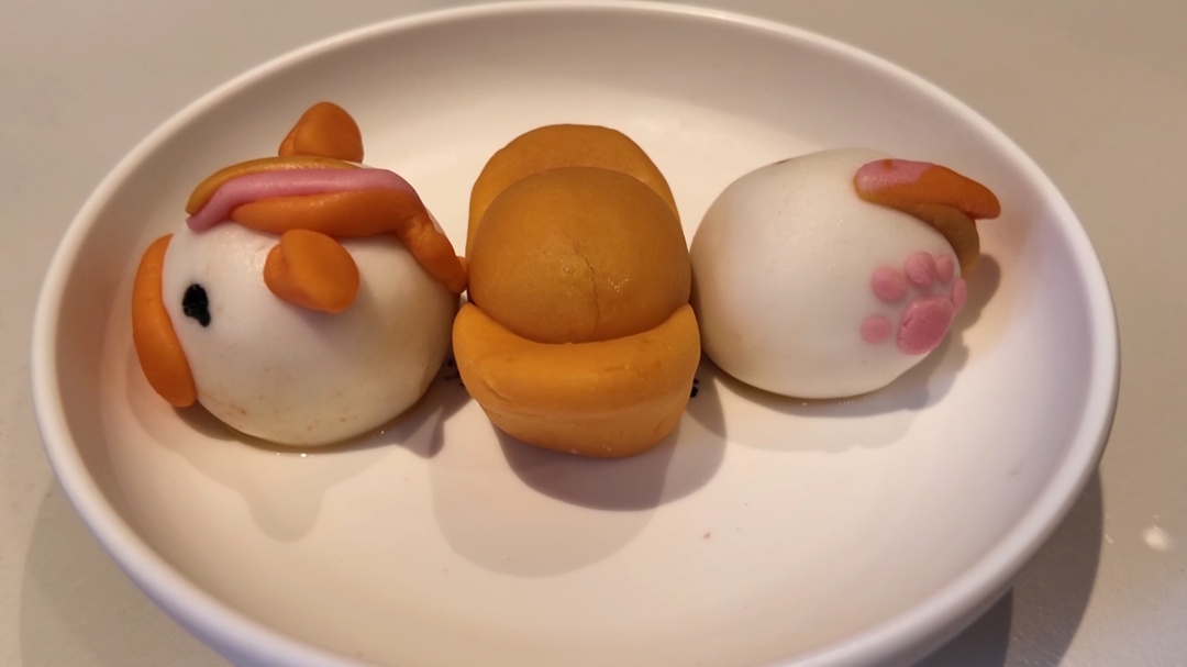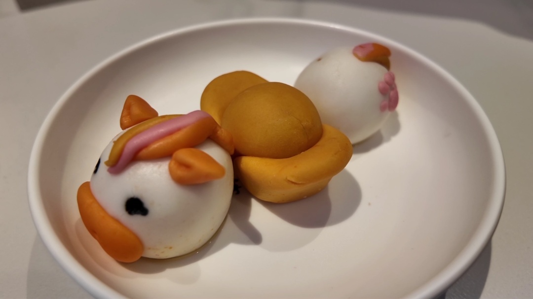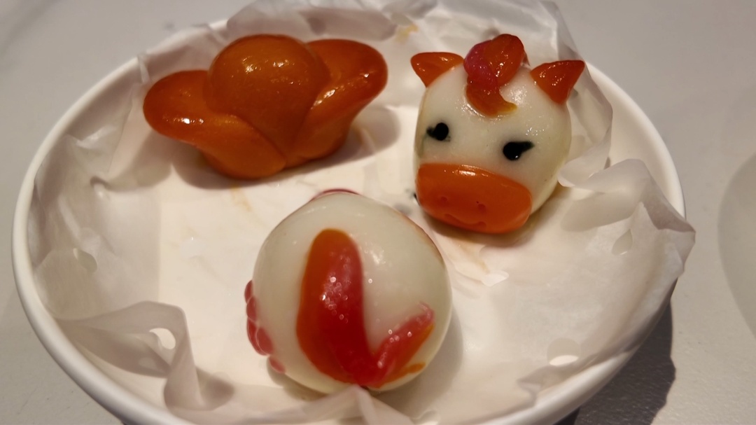 别看这三只马年福团色彩缤纷,其实所有颜色均取自天然食材。它们以宁波汤团的招牌糯米粉精心配比制成,耳朵、腮红、马尾巴等部位的颜色则分别源自草莓、南瓜等天然食材,无论是大人还是小孩,都能放心食用。福团的馅芯包裹着清甜软糯的莲蓉,经过蒸熟处理后,能够最大程度地确保颜色鲜艳、造型稳定。