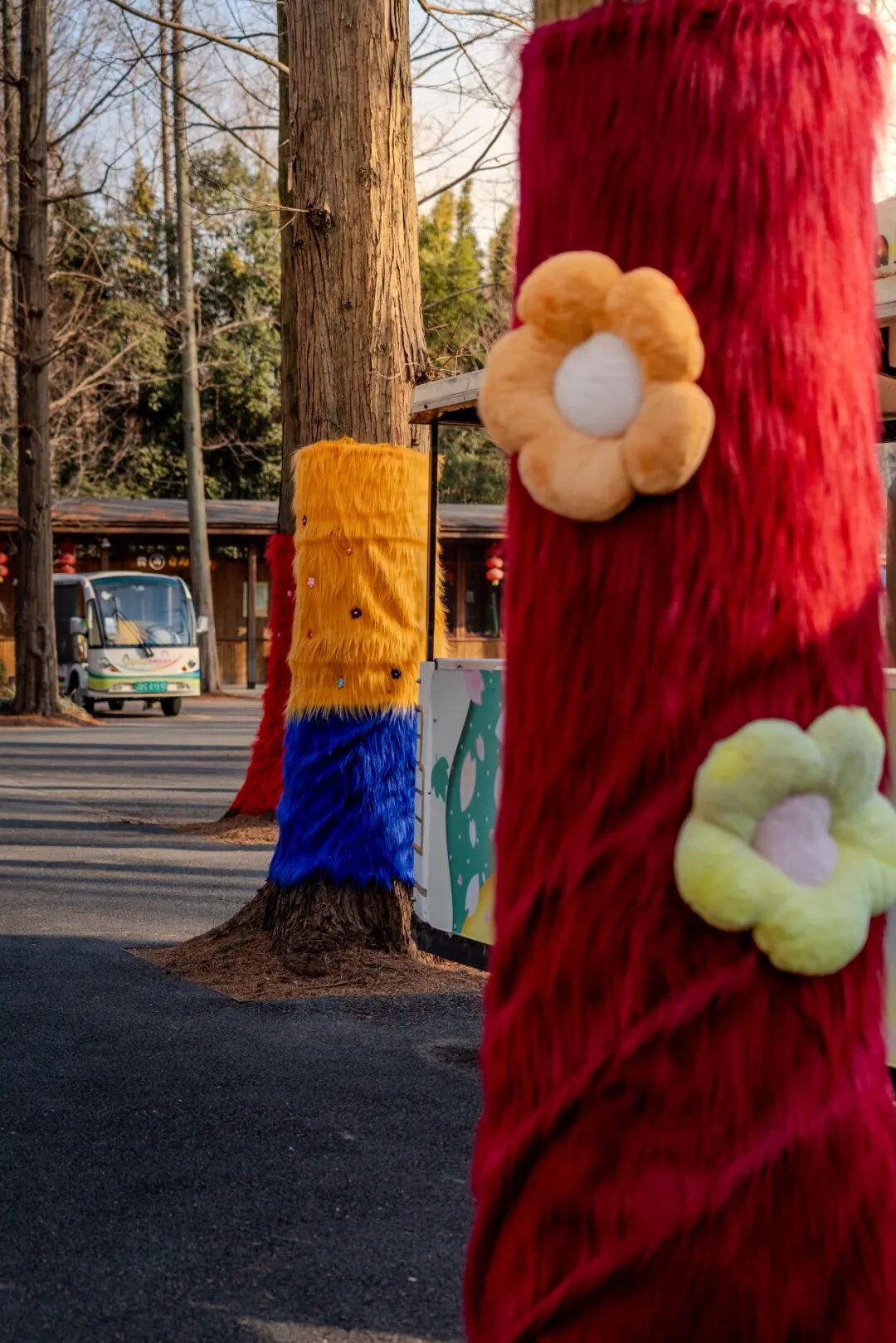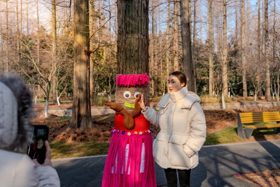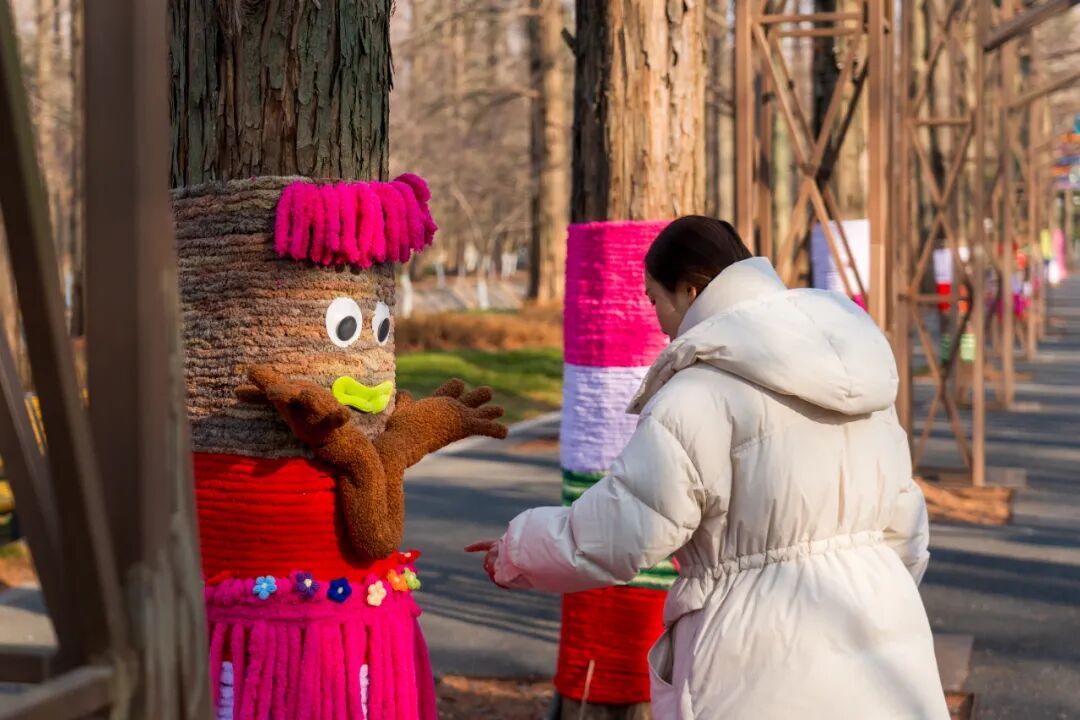 走进公园,原本灰褐色的树干被五彩的毛线温柔包裹,从明快的亮黄、柔和的粉紫到清新的薄荷绿,多种色彩交织碰撞,仿佛为树木披上了一件件“多巴胺”风格的时尚外套。走近细看,每件“毛衣”都别具一格:有的自带俏皮笑脸,有眨着灵动的双眼,有的还伸出了手臂,仿佛在邀请游客互动,可爱的造型吸引不少游客驻足打卡。