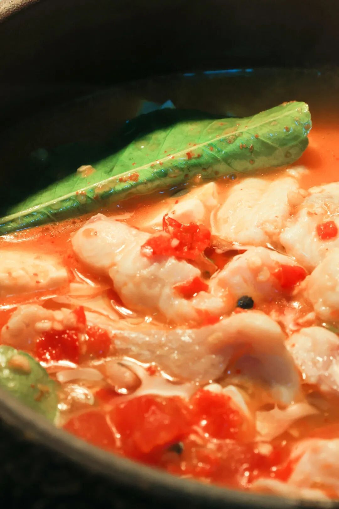 红酸汤通常由米酸或番茄发酵而成,以“酸、鲜、辣”三大特点闻名,这道菜在保留酸汤灵魂的基础上加入新鲜百香果汁液,搭配口感嫩滑的江团鱼块,能够品尝汤底的果香与自然甜感。