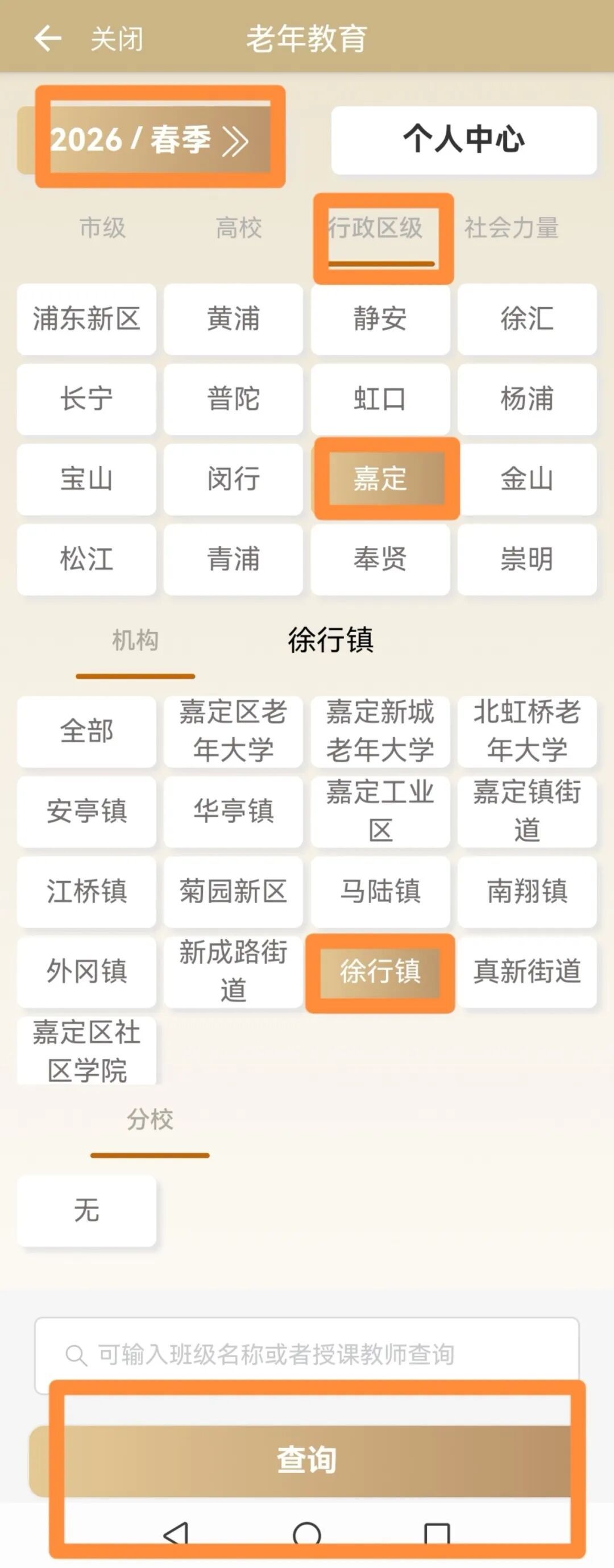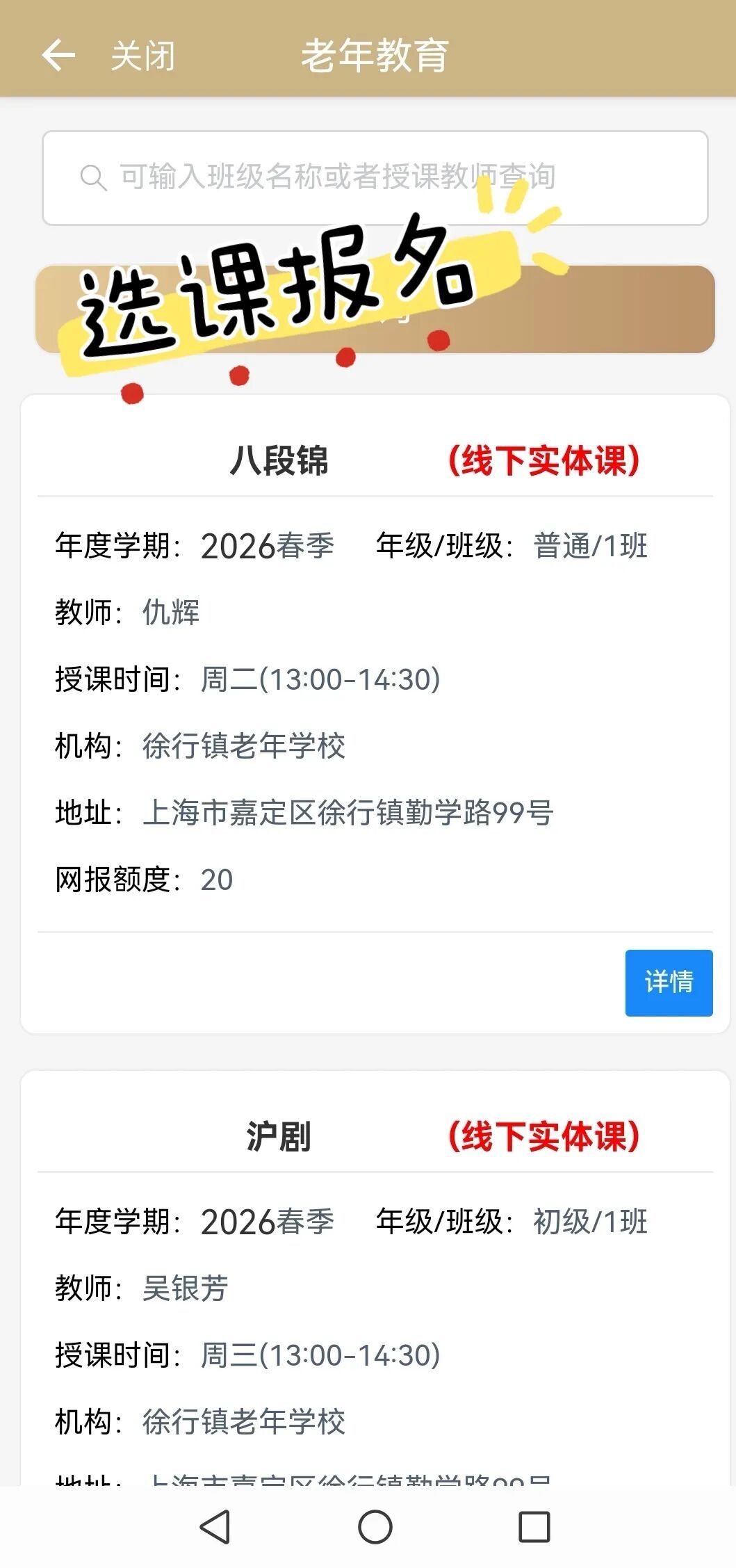 报名流程:随申办搜索“老年教育”点击进入——点击课程报名——选择行政区级(嘉定—徐行镇)——点击最下方查询——选课报名。
