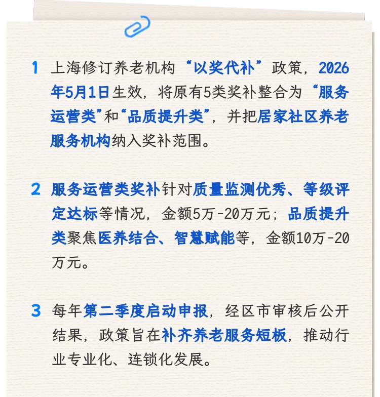 为深入贯彻落实《中共上海市委 上海市人民政府关于深化养老服务改革发展的实施意见》,进一步优化我市养老服务机构“以奖代补”政策,促进养老服务机构健康发展、提升养老服务质量,市民政局会同市财政局对《上海市养老服务机构“以奖代补”实施办法》进行了修订,将原有的5类奖补整合归并为“服务运营类”和“品质提升类”两大类别;将专业型老年人日间照护机构、社区长者食堂、居家养老服务机构等居家社区养老服务机构纳入奖补范围;增加对医养结合、智慧赋能、失能照护、认知障碍照护等服务的奖补项目。
