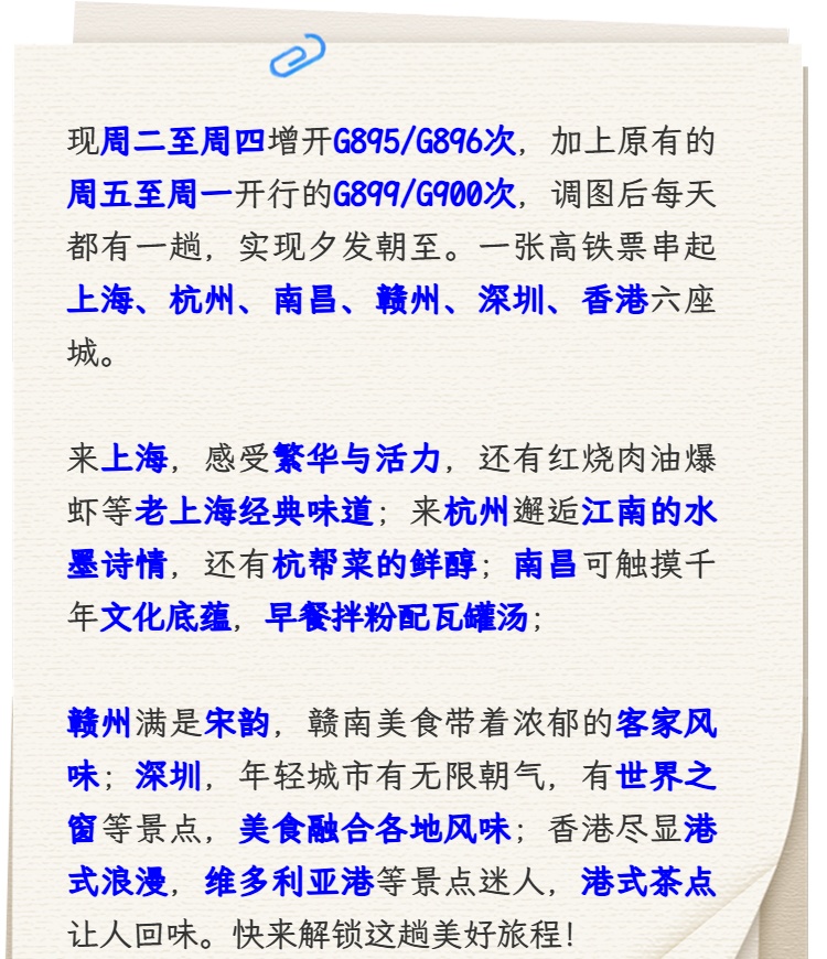 据上铁集团介绍,沪港跨境高铁动卧增开啦!调图后每天都有一趟,你的选择更多啦!点击“划重点”极速浏览↓↓↓现周二、周三、周四增开G895/G896次夕发朝至高铁动卧,由上海虹桥始发,经杭州东、南昌东、赣州西、深圳北,终到香港西九龙站。加上原来的周五、周六、周日、周一开行的G899/G900次列车,每天都有一趟,选择更多啦!综合自:上海发布、上铁集团编辑:宁平英转载请注明来自上海徐汇官方账号