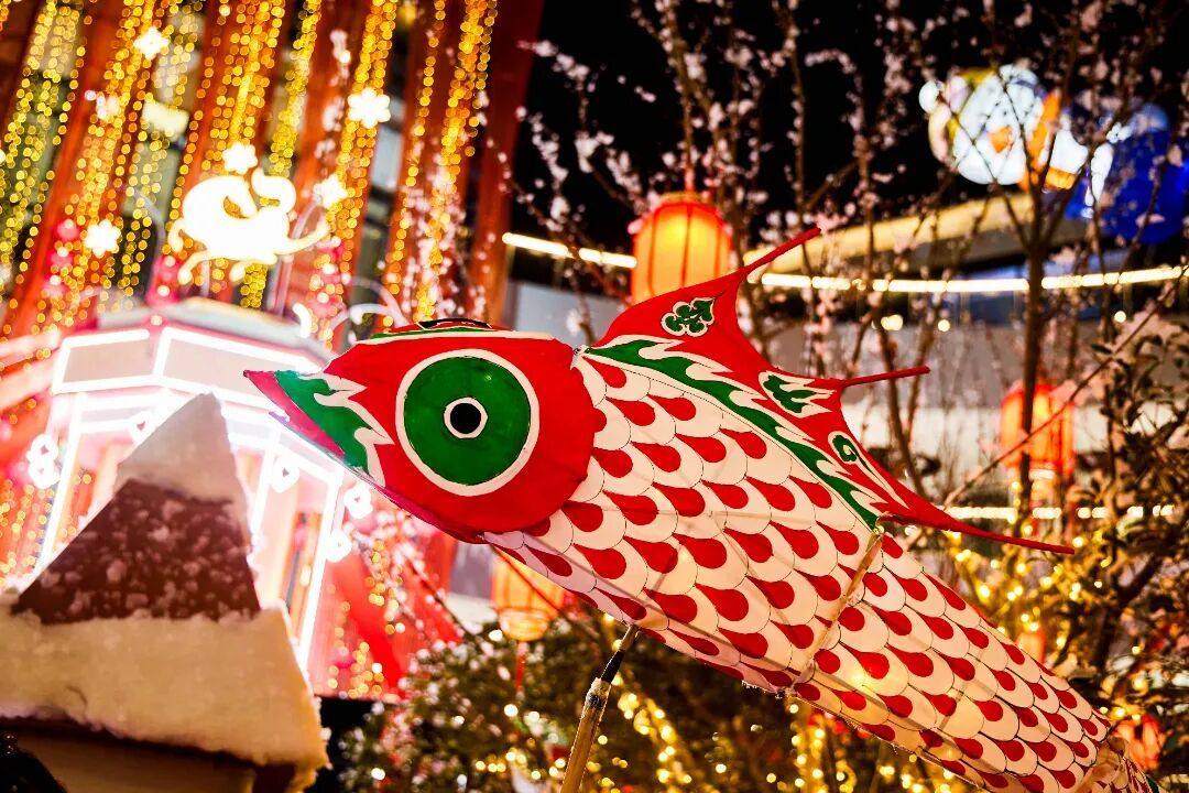 夜幕降临,位于商业街北里的巨型走马灯率先点亮,这盏高达12米的装置打造出双层沉浸式空间,尽显中式美学韵味。