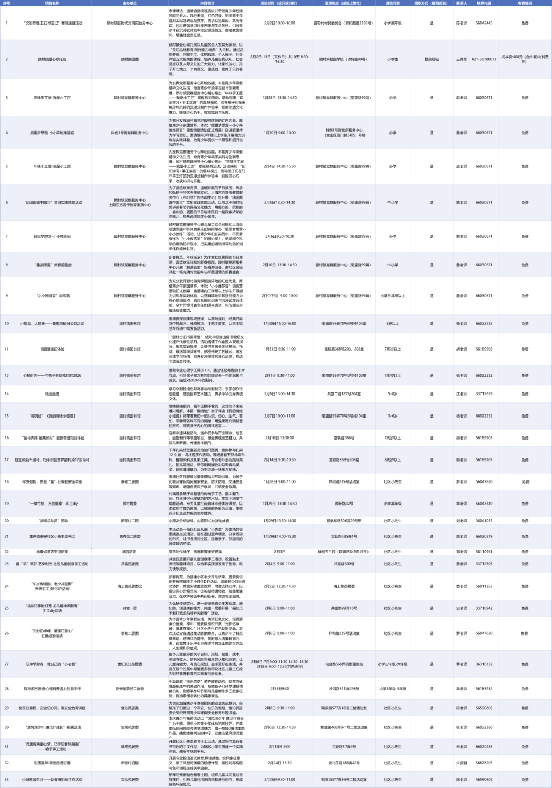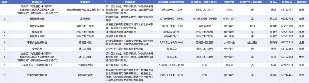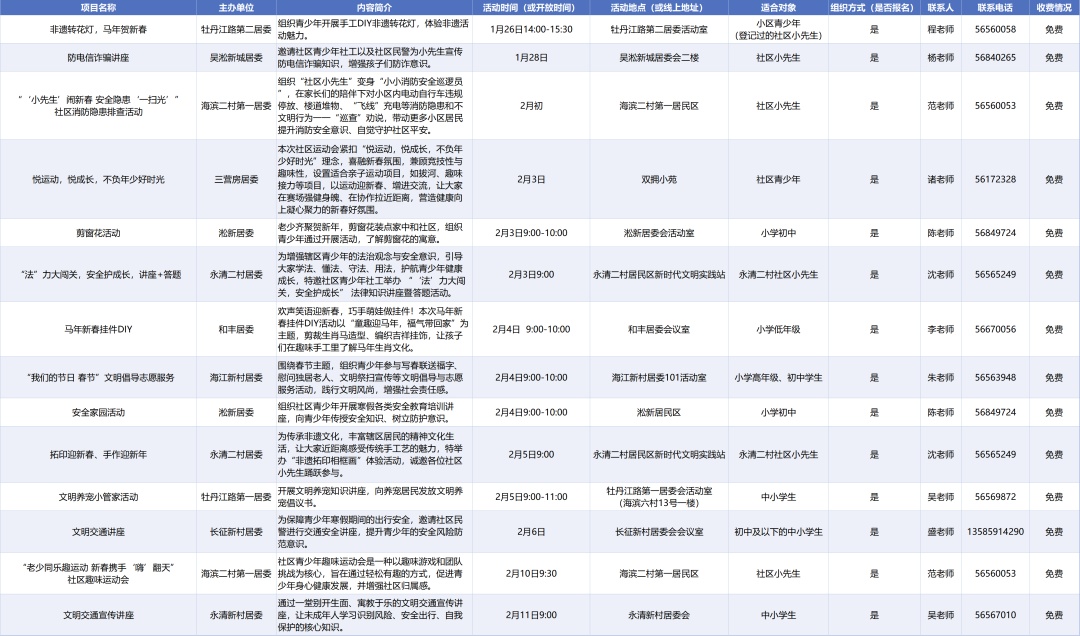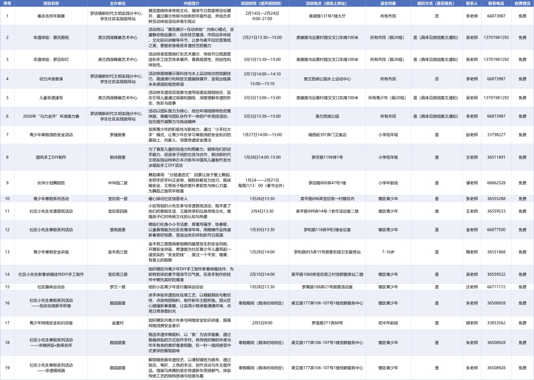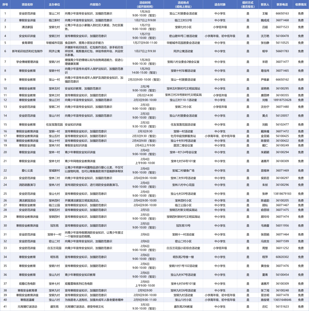 亲爱的家长和同学们,翘首以盼的寒假即将开启!这个冬天,不只有春节的烟火气,更要有成长的仪式感~ 为了让每一位同学度过一个平安、健康、快乐、有益的假期,全区各街镇、委办局精心策划了一系列主题活动,涵盖文化传承、劳动实践、志愿服务等多个维度,一起来看看吧,总有一项适合你! 委办局 (点击可看大图) 街镇 杨行镇 (点击可看大图) 月浦镇 (点击可看大图) 罗泾镇 (点击可看大图) 罗店镇 (点击可看大图) 顾村镇 (点击可看大图) 大场镇 (点击可看大图) 庙行镇 (点击可看大图) 淞南镇 (点击可看大图) 高境镇 (点击可看大图) 友谊路街道 (点击可看大图) 吴淞街道 (点击可看大图) 张庙街道 (点击可看大图)