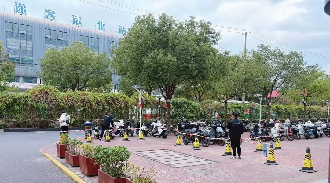 在彭浦镇塘南街区党总支及综合网格工作站的实地指导和建议下,社区入口区域被迅速改造,搭建了物理分隔并设置了禁止停放区域,剩余空间则被清晰地划分为外卖车辆、租户电瓶车及共享单车三个专属停放区。简单的“雪糕筒”和道闸杆,实现了空间的硬隔离。