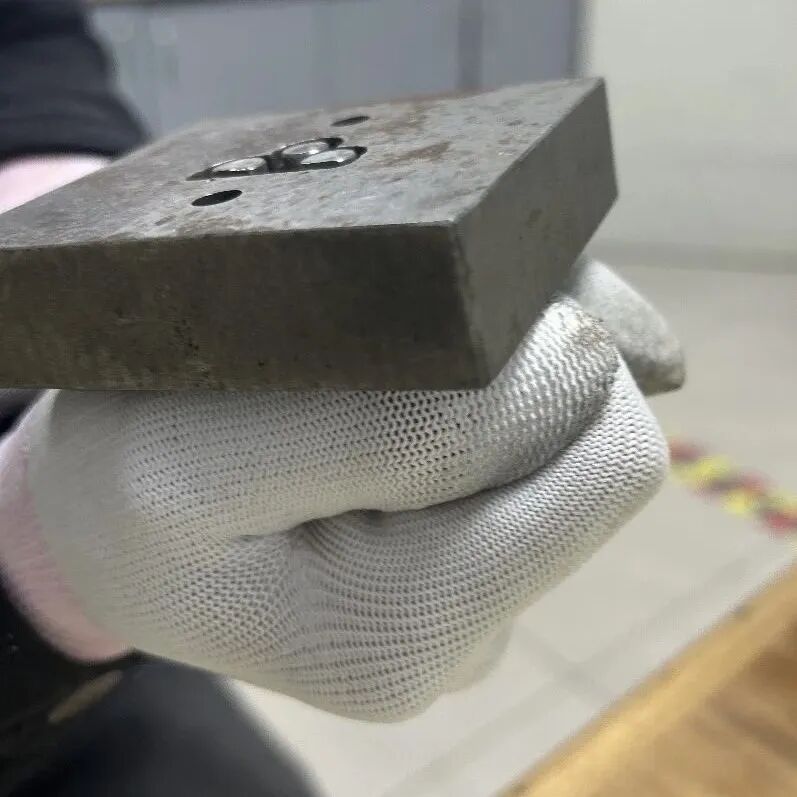 关键时刻,曹磊观察到钢钉与模具间的细微缝隙,果断采用“杠杆顶出”法:将一字螺丝刀插入缝隙,用榔头轻敲刀柄借力。过程中,螺丝刀把手虽意外断裂,但仍成功让钢钉露出模具表面,随后曹磊用老虎钳将三枚钢钉逐一拔出。