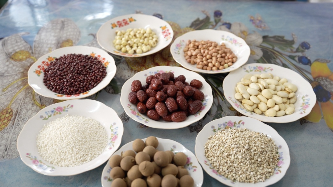 蒸汽腾起,在揭开锅盖的时候,带着甜香的暖雾弥漫。锅里的粥色泽深红褐亮,糯米粘稠地包裹着每一颗豆与枣,桂圆肉与洁白的莲子若隐若现,正如一幅年年好收成的丰饶图景。
