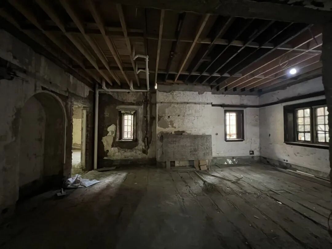 随着现场打开,一些有历史价值的构件暴露,原室内中不合理吊顶需取消,这导致本就无处可藏的电气设备管线需重新组织。在保护的前提下,施工团队利用各层新增吊顶、地板、木隔墙等隐蔽空间预埋暖通、强弱电气管线,隐蔽了空调、排风等,并定制带有中空玻璃的木窗,有效的加强建筑隔音保温功能,以适应当代的使用需求。
