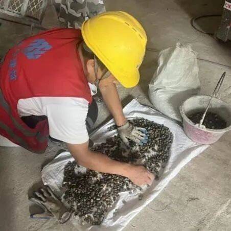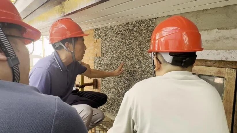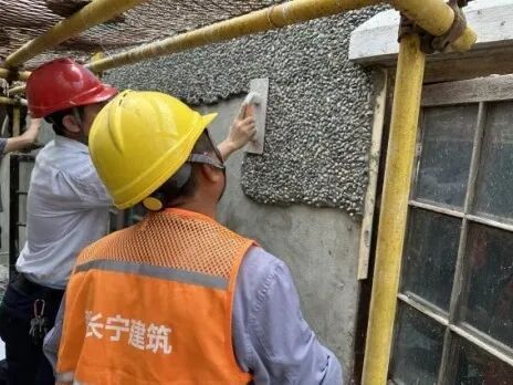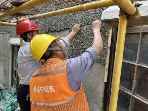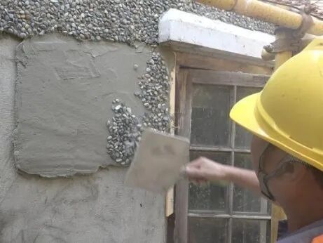 解决措施:经历保专家和施工团队反复验证,通过比对多种卵石颗粒、大小、形状质感,终于匹配到了最合适本幢房屋风貌的鹅卵石材料和粒径大小。由于卵石外墙施工需要结合甩、拍、压等多种工艺流程,石子的二次损耗相当大,仅仅是修复外墙,就用掉了10余吨卵石材料。