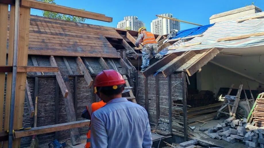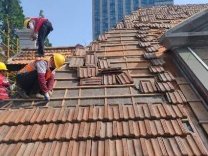 工艺流程:拆除面层→检修木屋架→白蚁防治→更换屋面板→更换防水卷材→铺设老瓦→收头粉刷