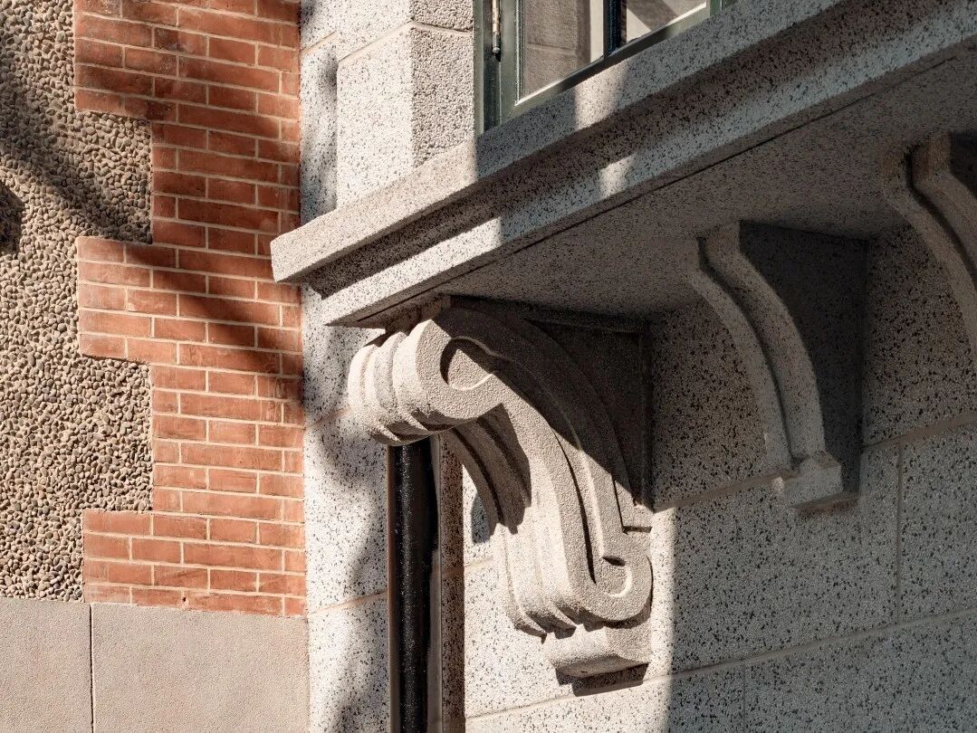 在将辅房结构加固重做的同时,外立面新做水刷石,使得主楼老洋房和东侧四层辅房在外立面形式风格协调的同时,存在有历史建筑变迁的可识别性。