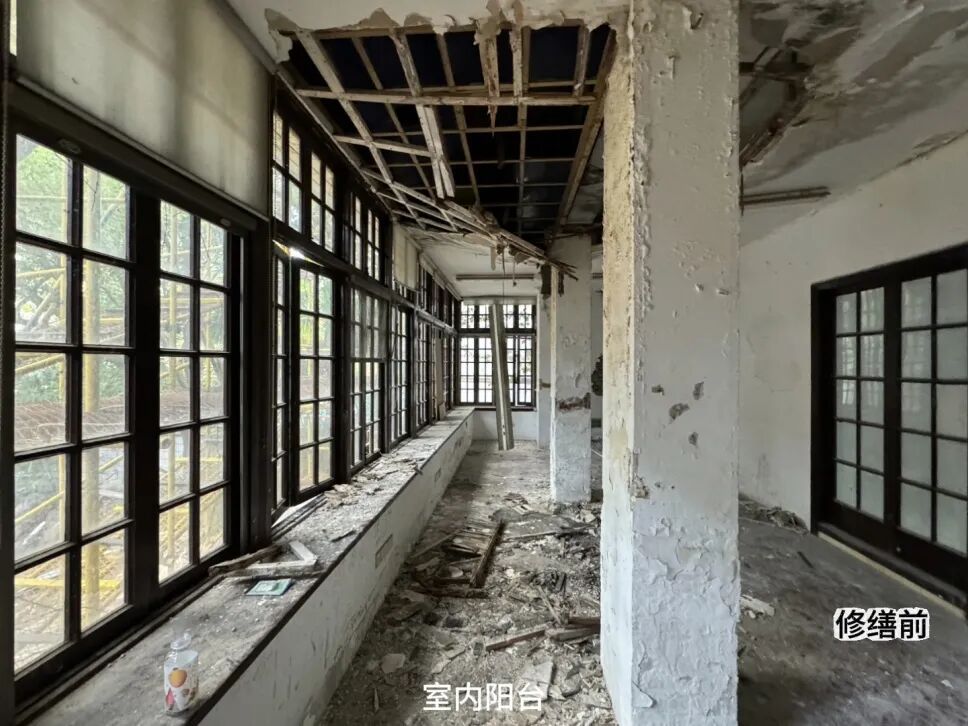 施工难点:修缮前,施工团队认真考证原始设计资料,多次进行现场勘查,发现主要存在墙面和装饰线脚风化损坏、防水层失效、屋面坍塌严重等问题,还有生长的野草野树更是对老洋房造成严重破坏,室内房间泥满平顶开裂、墙面渗漏水等现象普遍。