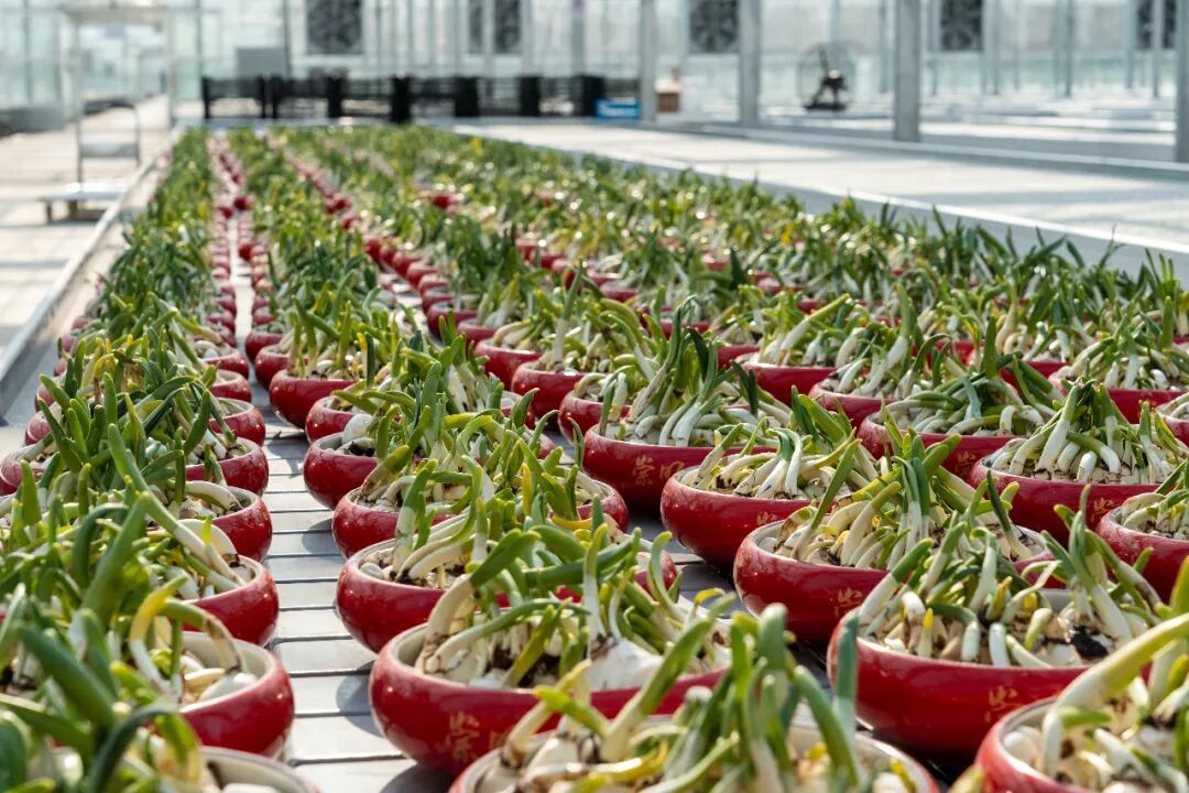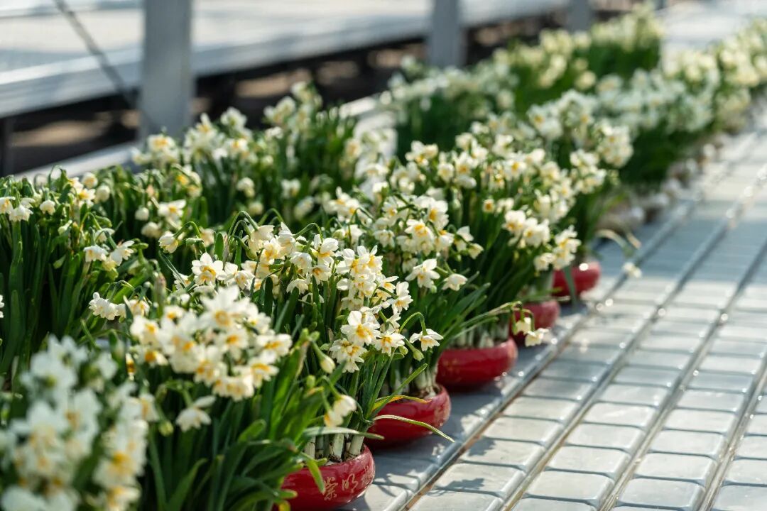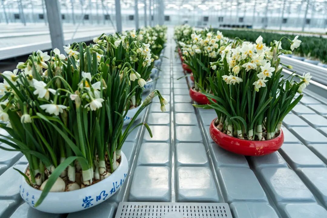 走进位于崇明现代农业园区内的水仙花种源中心,4.16万平方米的智能玻璃温室里一片生机盎然。眼前这批叶色青翠、长势均匀的水仙,正是中心实施“品质先行”市场策略的首批成果。