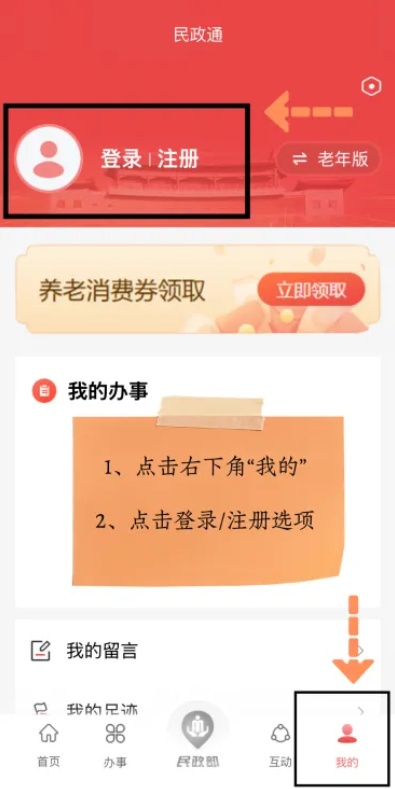 打开“民政通”APP或小程序完成注册,成功登录后,进入主页。