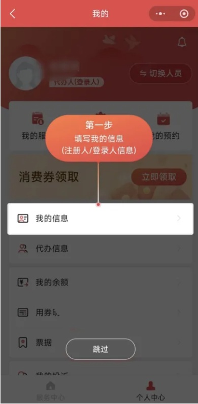 按要求准确填写“我的信息”“代办信息”,完成信息填写并提交后,点击“切换人员”进行切换。点击“立即领取”即可领取消费券。